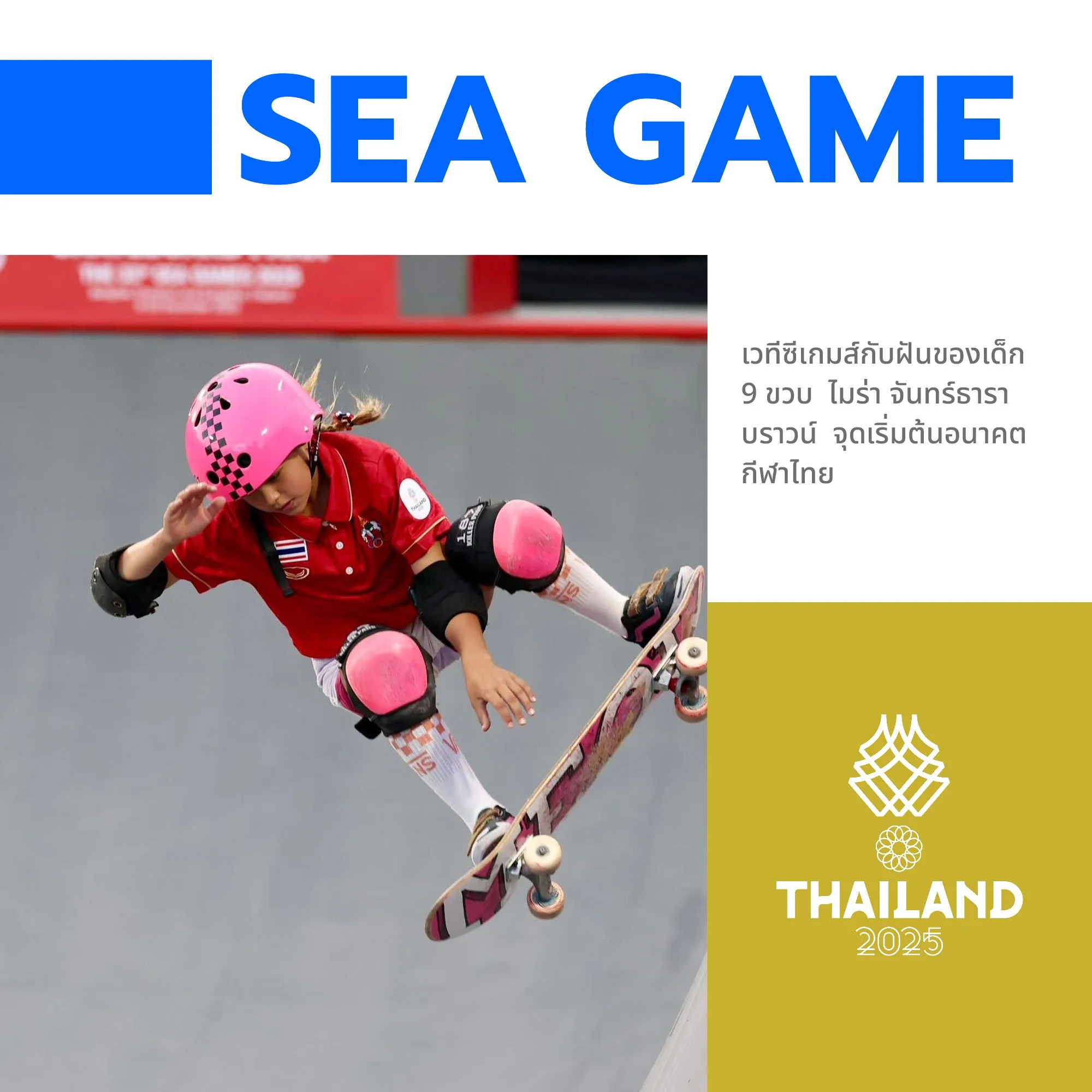 “หนูน้อยไมร่า” ไมร่า จันทร์ธารา บราวน์ นักสเก็ตบอร์ดวัยเพียง 9 ขวบ กลายเป็นนักกีฬาที่อายุน้อยที่สุดในมหกรรมกีฬาซีเกมส์ 2025 ในนามตัวแทนทีมชาติไทย กับก้าวแรกบนเวทีระดับนานาชาติที่ยิ่งใหญ่เกินอายุ